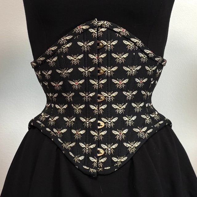 アンダーバストコルセットⅡ型 abeille 金糸で織られた蜂柄フランス産のジャガード織の布地を使用 ブラック...光沢感なし グリーン...光沢感のある青緑色 オリジナルパターンでしっかりくびれます。 アンダーバストラインを締め付けずウエストのみを締めることによって美しいくびれができます。 サイズ(フルクローズ) 16inch アンダーバスト60cm/ウエスト40cm 18inch アンダーバスト65cm/ウエスト46cm 20inch アンダーバスト70cm/ウエスト51cm 22inch アンダーバスト75cm/ウエスト56cm ※普段のサイズからウエストは-10〜15cm程度締まります。 表 ポリエステル 100% 裏 綿100% 前中心25cm 9inchバスク スパイラルボーン×8本 スチールボーン×4本 ¥39,000(+tax)